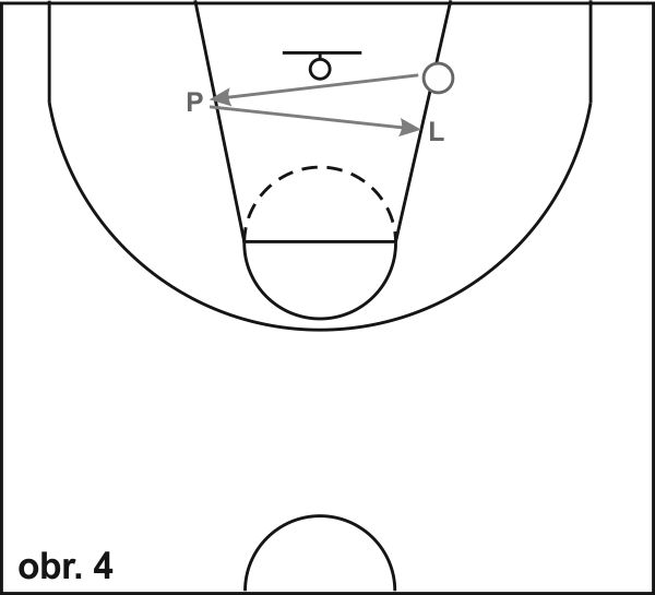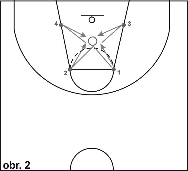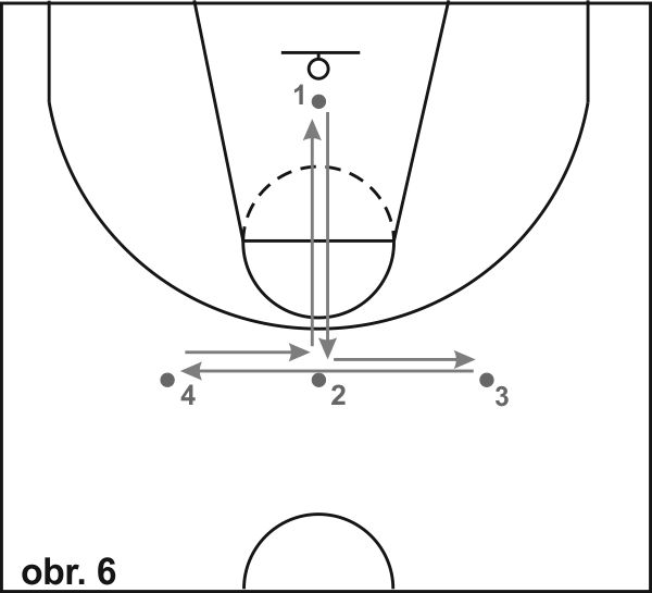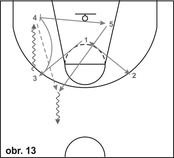 15) Obranná situace (obr. 13): Obránce začíná v základním postavení ve středu vymezeného území. Na pokyn vyráží co nejrychleji do bodu 1, kde se zastaví krokem levá-pravá a vyrazí během pozadu do základního postavení, odkud pokračuje v pohybu do bodu 3, kde je hráč s míčem (provede zastavení krokem pravá-levá, pravá ruka se snaží zabránit střelbě). Cvičení pokračuje driblinkem hráče s míčem do bodu 4, kde se zastaví a provede střeleckou fintu. Obránce kopíruje pohyb útočníka pohybem v širokém obranném postoji (pravá noha vpředu, levá ruka je pod kolenem levé nohy, dlaň vytočená směrem k míči, pravá ruka pokrčená v úrovni ramene). Jakmile hráč s míčem v bodě 4 zastaví driblink a provede' střeleckou fintu, obránce k němu přistoupí se vzpaženou pravou rukou. Cvičení pokračuje sprintem obránce do bodu 5, kde provede "box-out" (zadní obrátka na levé nebo pravé noze, paže nad úrovní ramen), a vyrazí co nejrychleji směrem na vrchol tří-bodového oblouku, kde chytá míč přihranný útočníkem a pokračuje v pohybu s driblinkem směrem k půlicí čáře. (1 do 2 sprint, 2 do 1 běh pozadu, 2 do 3 sprint a close out, 3 do 4 obranný pohyb (obrana hráče s míčem) plus střela, 4 do 5 sprint plus box-out plus vyběhnutí do protiútoku plus chycení přihrávky od hráče 1).