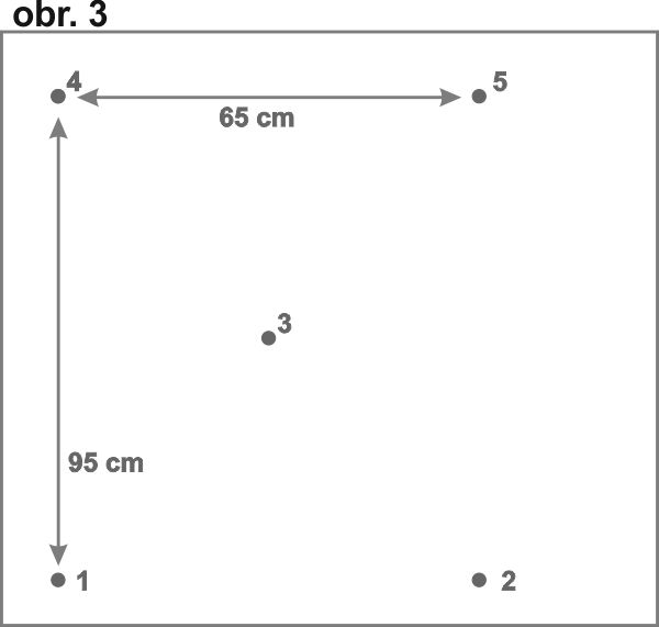 3) Skákání k bodům (obr. 3): 1. Poskoky do písmene X (levá noha na 1, pravá na 2, skok na 3 oběma nohama, skok levou na 4 a skok pravou na 5 a zpět), 2. trojúhelník na jedné noze: 2-3-1-2 a 1-3-2-1, cvičení trvá 10 vteřin (na každé noze) a počítáme, kolikrát se hráč dotkne palubovky, 3. poskoky do tvaru písmene Z (snožmo i na jedné noze): 4-5-3-1-2, 4. poskoky do tvaru písmene M (snožmo i na jedné noze): 4-5-3-2-1.
