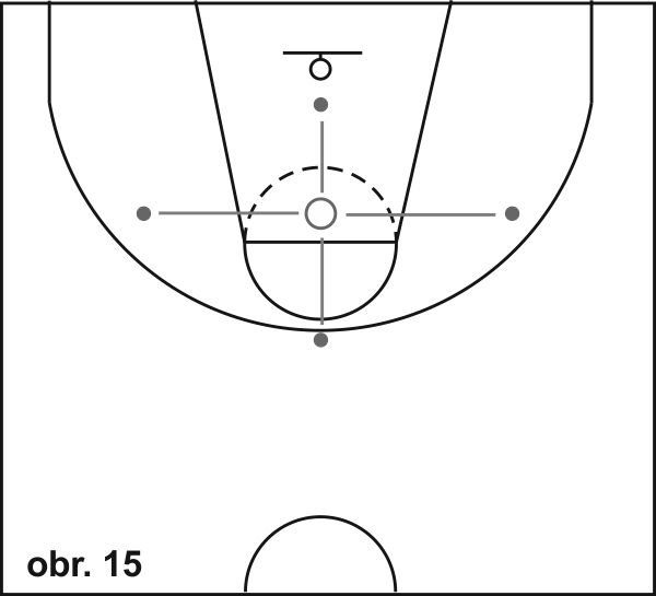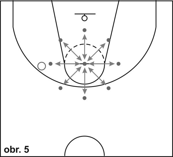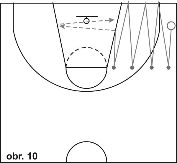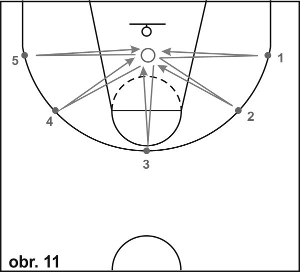 13) Close out (obr. 11): Rozmístíme 5 kuželů tak, jak je znázorněno na obrázku. Začněte v přípravné pozici pod košem obličejem do hřiště. Hráč začíná ve výchozím postavení ve středu vymezeného území, odkud na pokyn sprintujte k prvnímu kuželu, kde se zastaví krokem levá-pravá a vyrazí během pozadu do základního postavení. Tento pohyb opakuje ke všem kuželům a zpět (na druhé straně ,hřiště se zastavuje krokem pravá-levá). Pro hráče pokročilejší úrovně můžeme místo kuželů umístit hráče s míčem. Obránce startuje ze stejného základního postavení, ale při přiběhnutí k hráči s míčem reaguje na jeho činnost - pokud hráč naznačí střelbu, obránce zvedne paži nad ramena, pokud hráč zahájí únik driblinkem vpravo nebo vlevo, obránce vyrazí cvalem stranou 2 kroky ve směru driblujícího hráče. Po dvou úkrocích vpravo nebo vlevo se okamžitě vrací během pozadu do výchozího postavení, odkud obránce vyrazí k dalšímu útočníkovi s míčem.