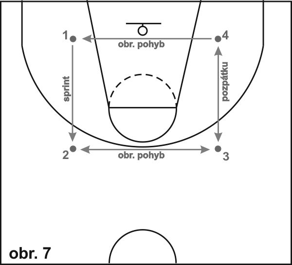 9) Čtverec (obr. 7): Rozmístíme 4 kužele do čtverce o délce strany 5 až 10 metrů. Hráč začíná u kužele 1 a pohybuje se následovně: 1 do 2 sprint, 2 do 3 Obranný pohyb čelem do čtverce, 3 do 4 běh pozpátku, 4 do 1 obranný pohyb zády do čtverce.