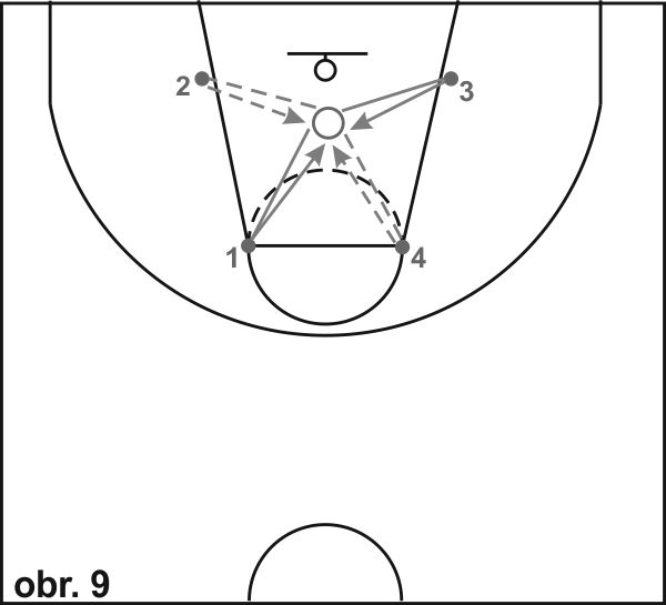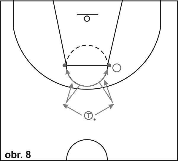 10) Půl kruh (obr. 8): Hráč začíná zády do kruhu v obranném postoji a na povel trenéra se pohybuje v obranném pohybu (cvalem stranou) po obvodu půlkruhu z bodu 1 do bodu 2 a zpět. Trenér má míč, stojí čelem k hráči přibližně 3 metry před kruhem a libovolně fintuje střelbu. Hráč reaguje na klamný pohyb trenéra co nejrychlejším pohybem směrem k míči s rukou vzpaženou směrem k míči, doplněným hlasitým zvoláním "Střela!". Ihned po dotyku míče se vrací zpět a pokračuje v obranném pohybu.