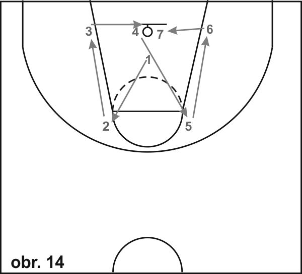 16) Vymezené území (obr. 14): Hráč startuje z prostoru pod košem a pohybuje se následovně: 1 do 2 obranný pohyb - levá noha vpředu, 2 do 3 běh pozadu, 3 do 4 obranný pohyb - pravá noha vpředu plus výskok s dotykem obroučky (nebo sítky), 4 do 5 obranný pohyb - pravá noha vpředu, 5 do 6 běh pozadu, 6 do 7 obranný pohyb - levá noha vpředu plus výskok s dotykem obroučky (nebo sítky),
