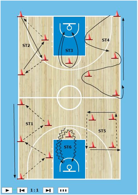 Trénink obsahuje 5 stanovišť. Na každém stanovišti se střídá dvojice pracujících hráčů (v případě že máme více hráčů, tak může pracovat dvojice najednou a střídat se s další dvojicí). Každý hráč je 30 vteřin v plné zátěži a dalších 30 vteřin (kdy pracuje ten druhý) má pauzu na odpočinek, popř. napití. V této pauze musí nahlásit trenérovi, kolikrát zvládl zopakovat celý cyklus na stanovišti během svých 30 vteřin. To celé se opakuje 4x na každém stanovišti (4 minuty). Dění na stanovištích se vysvětlí společně před zahájením cvičení. Po zahájení se tak pracuje celých 20 minut takřka v kuse. Na závěr můžeme sečíst všechny body za stihnuté úseky a získáme tak porovnání kondiční připravenosti mezi hráči v družstvu.