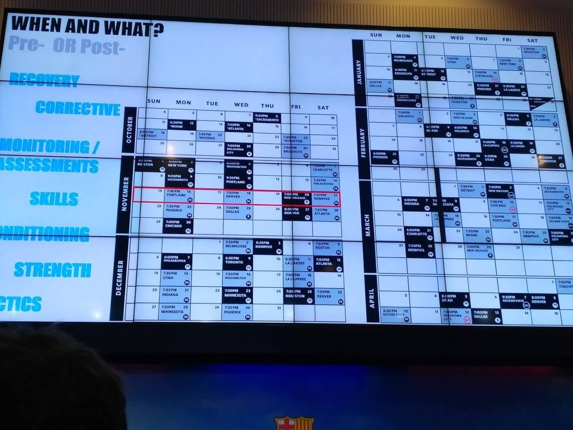 Svou přednášku otevřel náhledem do kalendáře týmu San Antonio Spurs, kde pracuje (obr. č. 1). Mezi záplavou utkání, dny věnovaným cestování a regeneraci se jenom vzácně objevil čas na trénink. Touto rychlou, ale pádnou ukázkou, demonstroval jak důležité je vypracovat jasný plán fyzické přípravy. Tento plán by měl postihovat všechny klíčové aspekty, které bude trénink rozvíjet. Současně by ale měl respektovat “pravidlo” minimální efektivní dávky. Minimální efektivní dávka v kondiční přípravě znamená, že v tréninku využijeme kombinaci minimálního objemu a intenzity, který stačí k vytvoření adaptačního stimulu, neboli k zlepšení hráče. Pokud jde o obsah tréninků, trenér Schelling uvedl svůj model, který obsahoval následující 3 skupiny na sebe navazujících tréninkových cílů:
