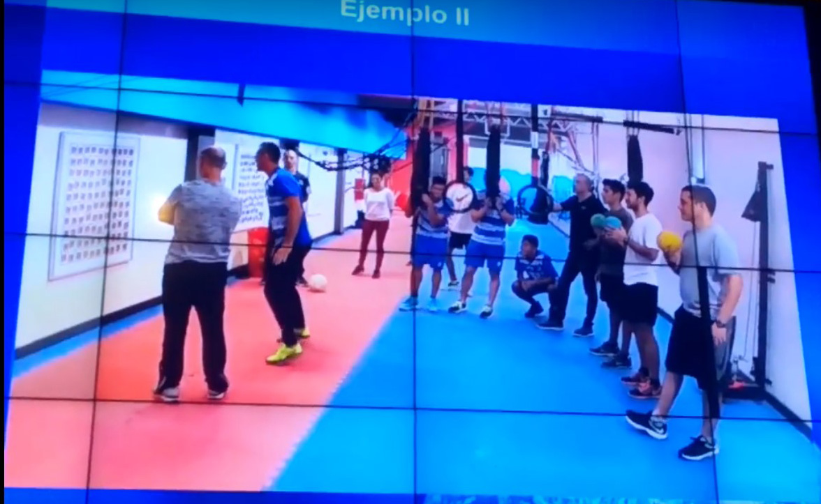 Roger Font účastníky konference seznamuje s pojetím kondičního tréninku, který probíhá přímo na hřišti, kde je rozmístěno několik stanovišť, na kterých se hráči v krátkých intervalech (přibližně do 10 sekund) střídají a přechází na vedlejší stanoviště. Tato část není zaměřena na obecný rozvoj kondice, ale na rozvoj specifických herních prvků ve ztížených herních podmínkách (např. úpolové přetlačování spoluhráče, které na dalším stanovišti přechází ve snahu o vytrhnutí velkého gymnastického míče z rukou spoluhráče, na které následuje opakovaná střelba na bránu při současném několikanásobném kontaktu protihráče (trenéra) velkým gymnastickým míčem, což klade velké nároky na celkovou stabilizaci a koncentraci na provedení střelby).